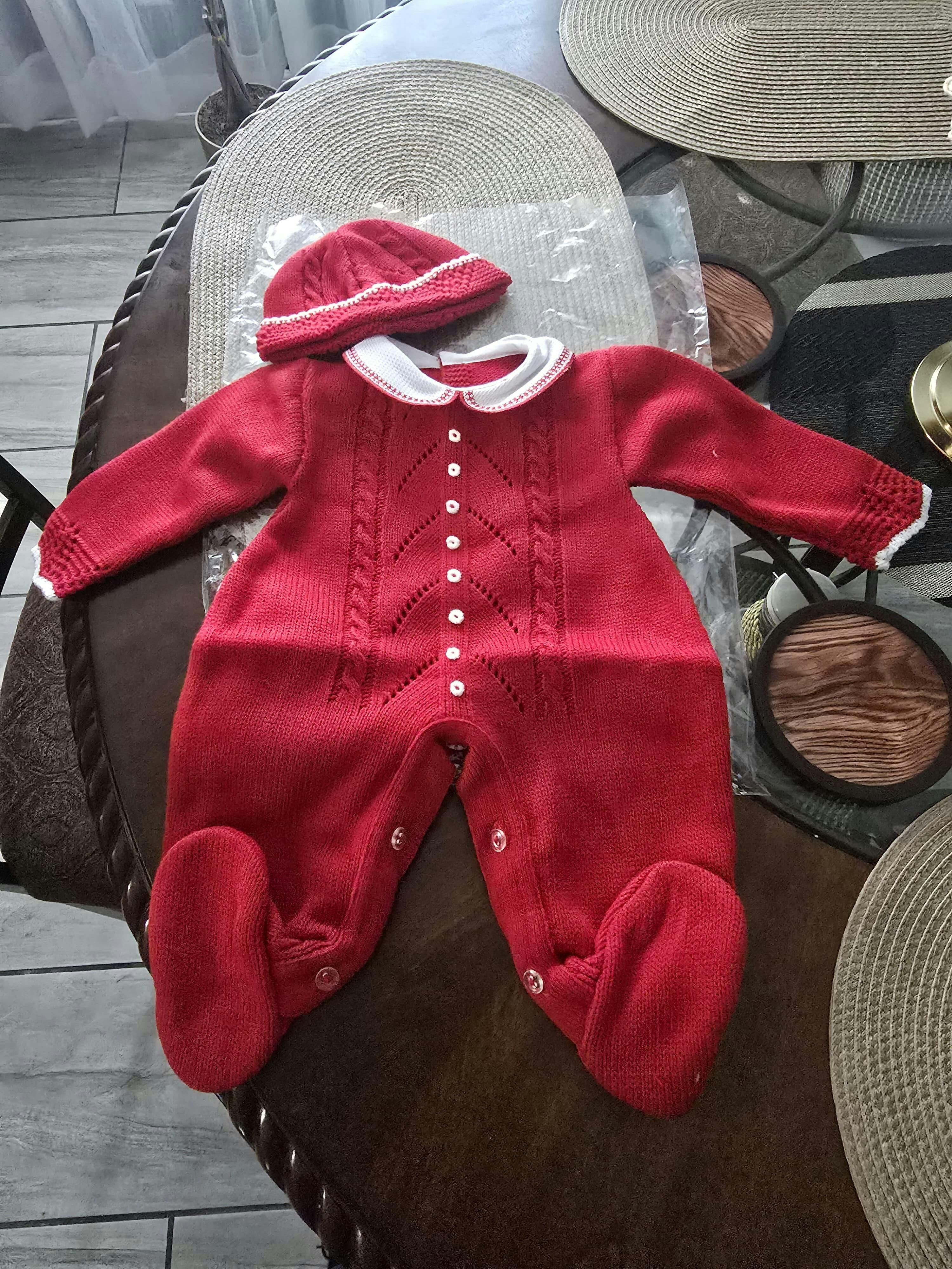 El diseño incluye un hermoso pelele con detalles calados y botones frontales, y un gorro a juego que aporta calidez y ternura.